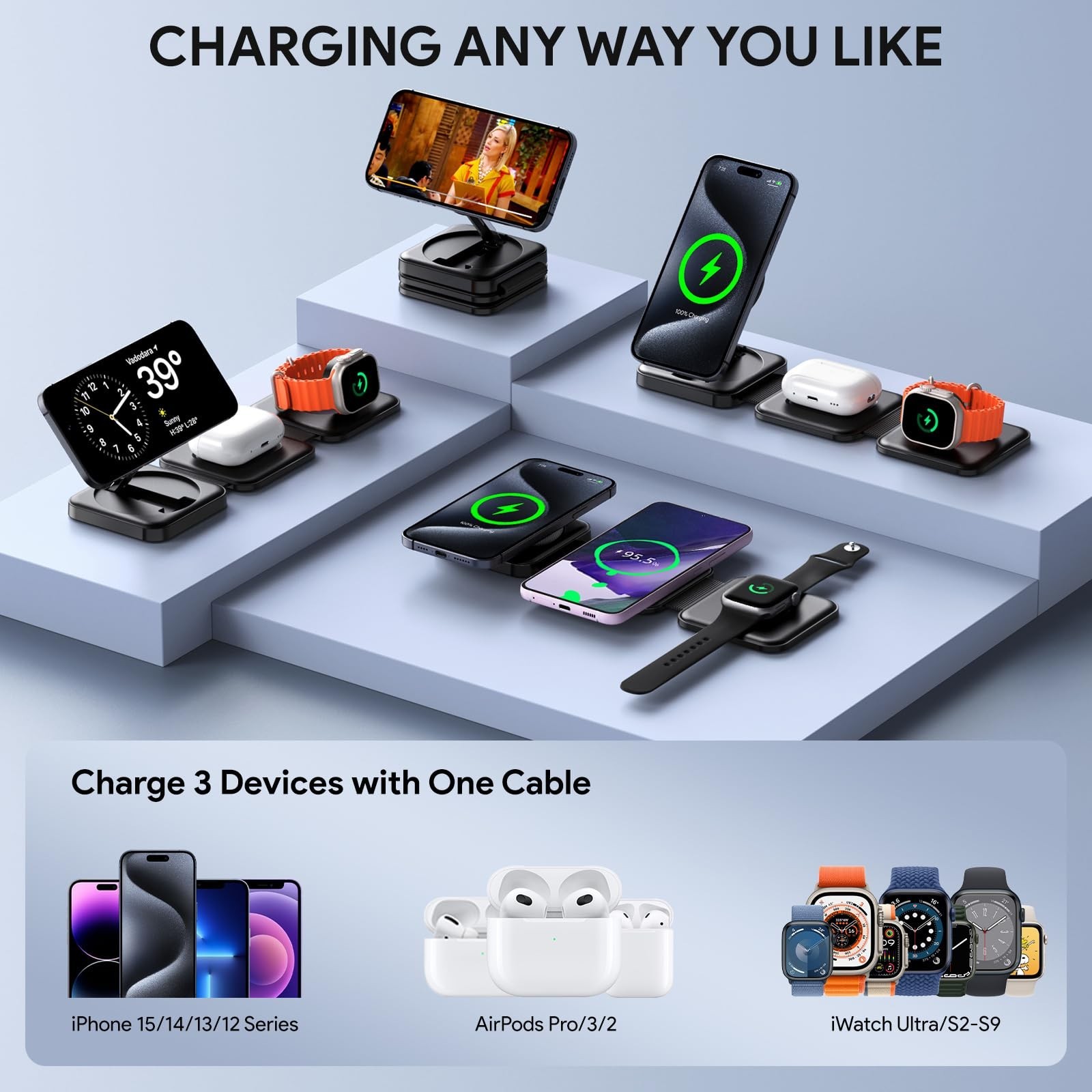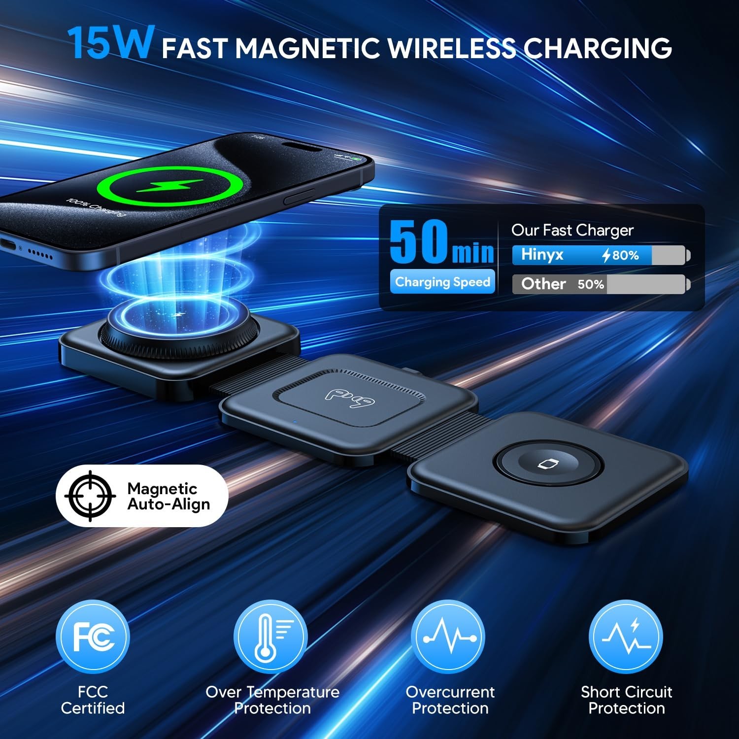 Wireless Charger, Hinyx Magnetic Foldable Portable Travel Charger, 3 in 1 Wireless Charging Station for 15/14/13/12 Product Details Brand: Hinyx Connectivity Technology: Wireless Connector Type: USB Type-A, USB Type-C Compatible Devices: ['iPhone 15/14/13/12 Series', 'Apple Watch (S2-S9/Ultra)', 'AirPods (2/Pro/3)'] See more Compatible Phone Models: 15/14/13/12 Series Included Components: Charging station, 1.2-meter cable, 18W adapter, possibly an earbuds charging pad Special Feature: Fast Charging Color: UK-Black Input Voltage: 9 Volts (AC) Mounting Type: Tabletop Mount Product Dimensions: 2.36 x 2.36 x 1.18 inches Item Weight: 11.3 ounces Item model number: AAA037 Date First Available: November 17, 2023 Manufacturer: Hinyx Wireless Charger, Hinyx Charger, Magnetic Foldable Portable Travel Charger, 3 in 1 Wireless Charging Station for 15/14/13/12