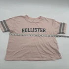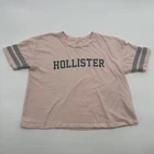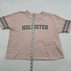 This is a Hollister crop top for women in size XS, featuring a pink color with a graphic logo design. The t-shirt has a solid pattern, short sleeves, a crew neck, and a relaxed fit. Made of 100% cotton, it is a casual style suitable for summer, fall, and spring seasons. The top has a beach, classic, and California theme, and it is a pullover closure garment. Check pictures flaws and measurements