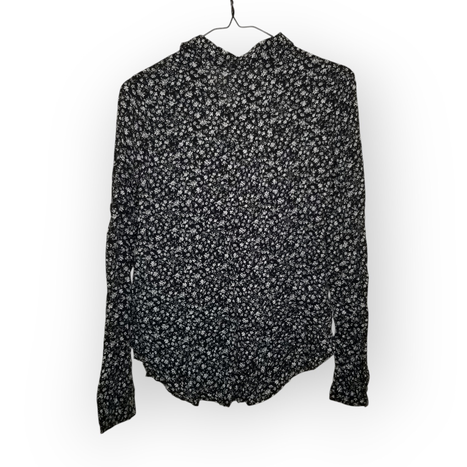 Chic floral blouse with button-up front. Perfect for casual or office wear. Lightweight and stylish. Hollister blouse full button front top black with white ditzy floral print long sleeves women's XS excellent pre-owned condition Measurements are approx and taken flat: Pit to pit: 17.5" Shoulder to hem: 24" y2k feminine goth career layer preppy prairie cottagecore