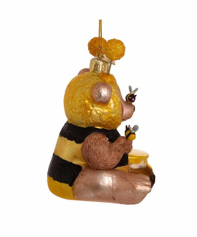 Honey Bee Bear Ornament NBX0020 Kurt Adler's Noble Gems™ glass bee bear ornament is a fun and festive addition to any holiday décor. This ornament features a brown bear dressed in a glittered bee outfit. This little bear has a "Honey" pot and a bee on its nose. Glass Ornament is 4.25" Powered