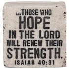 scripture stone block features simple design with deeply encouraging sentiment Features laser engraved sentiment "…Those who hope in the Lord will renew their strength. Isaiah 40:31" Made of reconstructed concrete to simulate natural-cut stone with stone texture Measures approximately 2.25 x 2.25 Inches; Display on a desk, tabletop or shelf arrangement Your purchase helps support orphans and children with special needs in Ghana, Africa