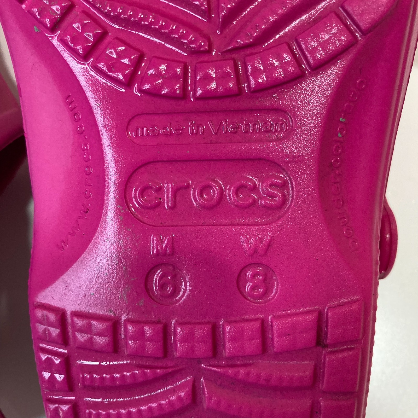 The Crocs Adult Hot Pink Everyday Clog Shoes in size M6 & W8 are comfortable and stylish slip-on shoes perfect for casual occasions in the summer, fall, and spring seasons. These clogs have a flat heel and round toe shape, making them easy to wear for everyday activities like walking. The vibrant pink color, rubber outsole, and synthetic lining material add a pop of color to your outfit while the Crocs logo accent adds a classic touch. With standard shoe width and low top shoe shaft style, these Crocs are a versatile and practical choice for unisex adults.