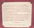 Hallmark Keepsake Ornament Howdy Doody TV Show Lunch Box Set 2 Piece Ornament -1999 Vintage Collectible. The ornament arrives in it's original box in almost like new condition. Contains 1 - lunch box and 1 thermos The item in the pictures is what you will receive We are the original owners