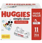 Product Description Huggies Simply Clean Fragrance Free Baby Wipes offer convenience and cleanliness, making them a must-have for the whole family. Not only are they soft and safe for sensitive baby bottoms, but they can also be used to wipe hands and faces for toddlers and children. Kids outgrow diapers, not messes, so the Simply Clean unscented disposable wipes are the perfect solution wherever you go. These disposable diaper wipes are made with plant-based ingredients and have been for over 20 years to provide you and your baby a reliable clean. To help maintain healthy skin, the Simply Clean baby wipes are hypoallergenic, dermatologist-tested and pH-balanced. They also are fragrance free, alcohol free, paraben free and do not contain phenoxyethanol or MIT. The Huggies Simply Clean Baby Wipes feature flip-tops with EZ Pull 1-Handed Dispensing and exclusive Disney-themed packaging. (*70%+ by weight) About this item 11 flip-top packs of 64 unscented baby wipes (704 wipes total) Grab & Go: Cleans messes here, there and everywhere; take these unscented baby diaper wipes wherever you take messes; EZ Pull 1-Handed Dispensing makes it easy to grab wipes without wasting sheets No Harsh Ingredients: Free of lotions, fragrances, parabens, alcohol, dyes and elemental chlorine; does not contain MIT or phenoxyethanol Hypoallergenic, dermatologist tested and pH balanced to help maintain healthy skin Plant-based wipes since 1990*; packaging may vary from image shown