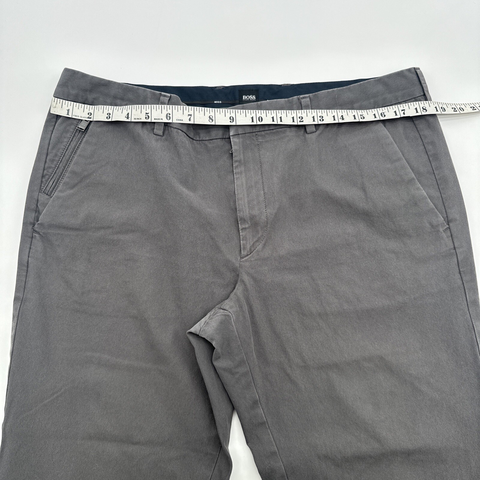 These are Boss Hugo Boss classic pants for men in size 38, featuring a solid gray color with a Chino style. They have a zip, button, and hook & eye closure with pockets and a logo accent. Made of Elastane Polyamide and Cotton materials, they have a straight leg and a 26-inch inseam. These pants are suitable for various occasions such as travel, parties, formal events, and business settings. The brand is Hugo Boss and the fit is classic. Check pictures for flaws and measurements