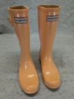These Hunter Wellies are still in great shape—perfect for muddy adventures! The orange color is bright and fun, and the buckles add a cool touch. There’s some wear on the tread and a cracked strap, but they’re totally sturdy for playtime. My kid loves them!
