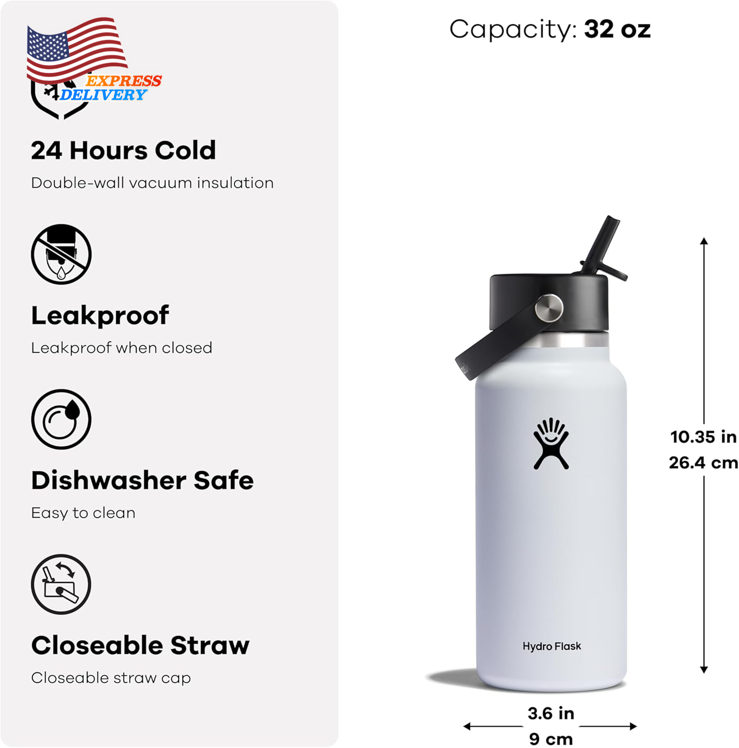 Store New Arrivals Add to Favorite View Feedback Contact NEW Hydro Flask 32 Oz Wide Mouth Bottle with Flex Straw Cap Agave Description Warranty Description LIFETIME Capacity 1 Fluid Ounces Number of Items 1 Style 32 Oz Package Weight 0.57 Kilograms Theme Solid With Lid Yes Cap Type Flex Cap Product Dimensions 5.75"W x 9"H Material STEEL Suggested Users Unisex-Adult Model Name Wide Flex Straw Cap Item Package Dimensions L x W x H 10.79 x 4.53 x 4.37 inches Age Range (Description) Adult Item Weight 1.07 Pounds Special Feature Vacuum Insulated Part Number W32BTS- Item Dimensions LxWxH 5.75 x 5.75 x 9 inches Color Agave Base Diameter 3.5 Inches Recommended Uses For Product Water Included Components Bottle Product Care Instructions Hand Wash Only Size 1 Ounces THE BEST BOTTLE: A 32 oz Wide Mouth insulated water bottle with Hydro Flask's leakproof Flex Straw Cap—easy to fill, easy to drink. Open it up, add your ice, and flip to sip. The insulated stainless steel keeps it cold for up to 24 hours. 24 HOURS COLD: Double-wall vacuum insulation keeps drinks hot or cold for hours. The insulated water bottle keeps beverages cold for 24 hours. The TempShield insulation keeps drinks cold all day. LEAKPROOF: Say goodbye to leaky water bottles. The Flex Straw Cap is leakproof when closed. Simply close it shut and toss it into your bag without worry. Sip effortlessly with one hand, thanks to the easy-to-use straw design. Click it shut, and rest easy knowing your drink stays securely sealed all day. PURE TASTE: Durable pro-grade stainless steel ensures pure taste and no leftover flavor transfer. So, today's water won't have any taste of yesterday's iced tea. DISHWASHER SAFE: Easy to use and easy to clean, just dissasembler the straw lid and toss the lid and bottles into the dishwasher. Designed to keep bright color, being dishwasher safe means your favorite Hydro Flask is always at-the-ready. From the manufacturer The video showcases the product in use. The video guides you through product setup. The video compares multiple products. The video shows the product being unpacked. Compare Hydro Flask Products Add to Cart Add to Cart Add to Cart Add to Cart Add to Cart Customer Reviews 4.6 out of 5 stars 9,698 4.7 out of 5 stars 6,825 4.6 out of 5 stars 128 4.6 out of 5 stars 310 4.8 out of 5 stars 188 Price $36.00 $ 36 . 00 $26.21 $ 26 . 21 $33.71 $ 33 . 71 $33.71 $ 33 . 71 $39.95 $ 39 . 95 Cap Straw Cap Press-in Straw Lid Chug Cap Straw Cap Straw Cap Fits Cupholders No Yes Yes Yes Yes Leakproof, Leak-resistant Leakproof Leak-Resistant Leakproof Leakproof Leakproof Dishwasher Safe Yes Yes Yes Yes Yes Capacity 32 Oz 32 Oz 32 Oz 32 Oz 24 Oz ABOUT US We offer the best prices around on high quality products. Our E-store includes media such as books, movies, music and games while offering electronics, toys, sporting apparel, clothing, tools, general home, garden items and more. SHIPPING We are always working hard to ensure your package arrives as soon as possible. Please understand that some factors like weather, high postal traffic, and the performance of shipping companies are outside of our control. We offer free shipping to the lower 48 states and ship within 2 business days of payment, usually sooner. We do not accept P.O. Boxes. Please provide a physical address. For shipping outside of the continental USA, we only use eBay's Global Shipping Program.The item is shipped to KY and then sent to the rest of the world. International customers are responsible for all duties and taxes. Continue to check out in order to calculate costs for shipping the item to your country. Messages regarding eBay's Global Shipping Program MUST be directed at eBay EXCLUSIVELY. RETURNS We offer a 30-Day Return Policy on items which you are not completely satisfied with. You have the option for a full-refund or an exchange of the item. No returns are available on items shipped outside of the USA. PAYMENT We accept PayPal. CONTACT US This page content is yet to come Please ad us to your favorite seller and visit again later Thank You CUSTOMER SATISFACTION We try our very best to make sure every customer is completely satisfied. If there's a problem, message us! We're happy to help. WE ACCEPT Copyright © 2021 AutoDS. | All Rights Reserved