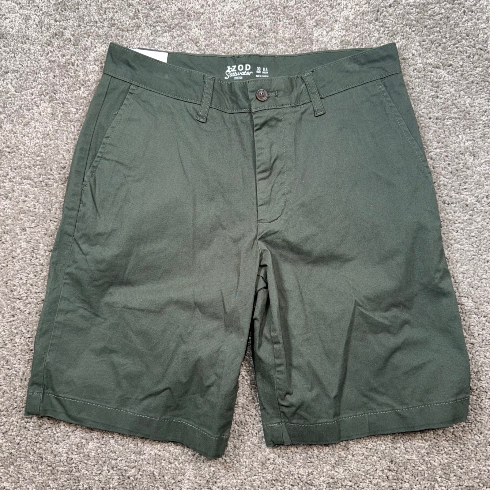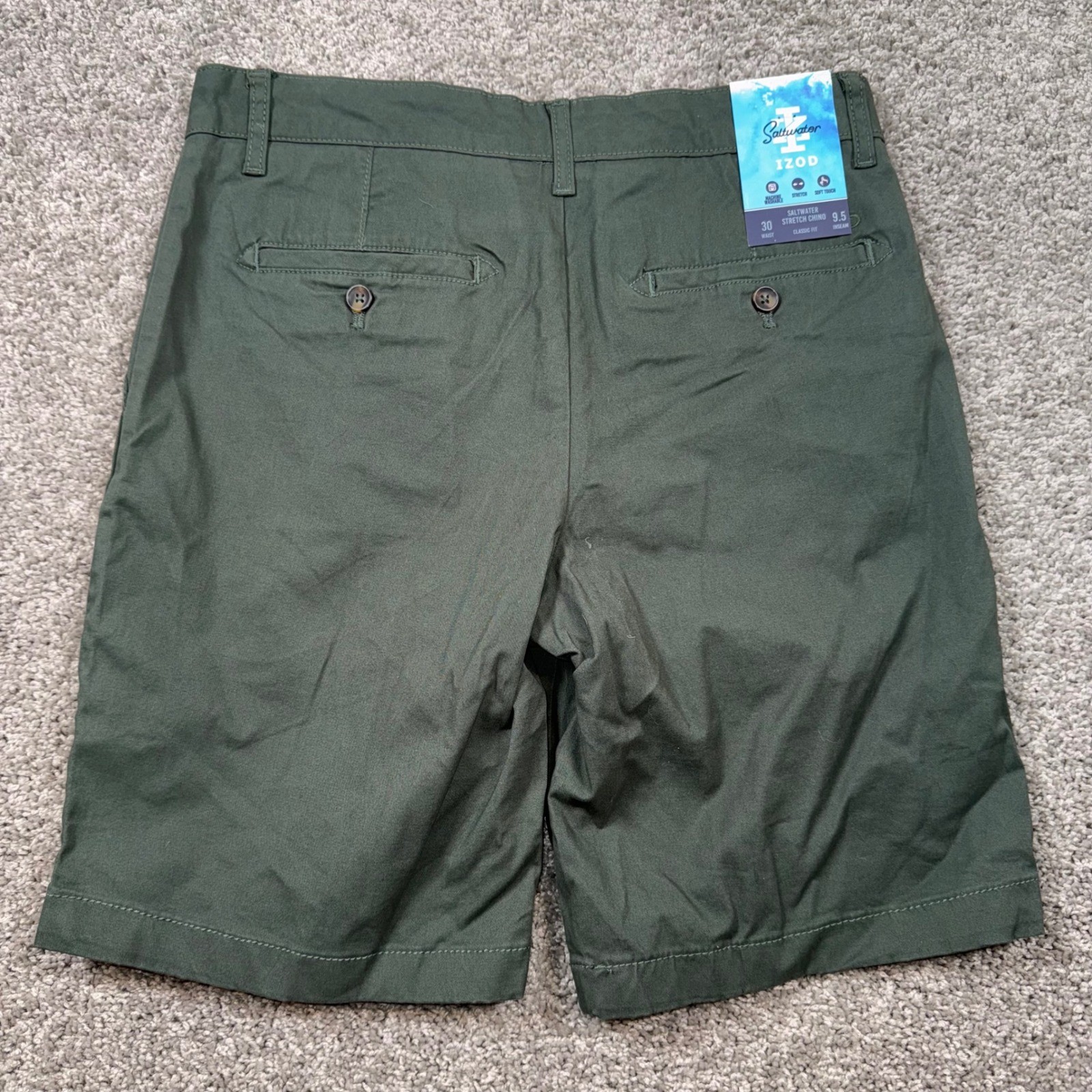 **NOTE: There are flaws around the waist. Please see photos for detail/reference** --------------------------------------- IZOD Saltwater Stretch Chino Shorts offer comfort and style for any occasion. These classic fit shorts are designed with stretch fabric for ease of movement and a soft touch for all-day wear. The versatile olive green color makes them perfect for a casual day out or a relaxed evening gathering. Measurements: • Waist: 30 in • Inseam: 9.5 in Style: Chino Department: Men Material: Cotton, Spandex Waist Size: 30 in Occasion: Casual, Travel Fabric Type: Canvas Pattern: Solid Features: Pockets, Stretch, Easy Care Fit: Classic Inseam: 9.5 in Front Type: Flat Front Closure: Button Accents: Button, Logo Season: Spring, Summer, Fall Rise: Mid (10-12 in) Keywords: IZOD Shorts, Mens Chinos, Stretch Fabric, Classic Fit, Olive Green, Casual Wear, Summer Style, Comfortable, Versatile, Outdoor Apparel, Everyday Essentials