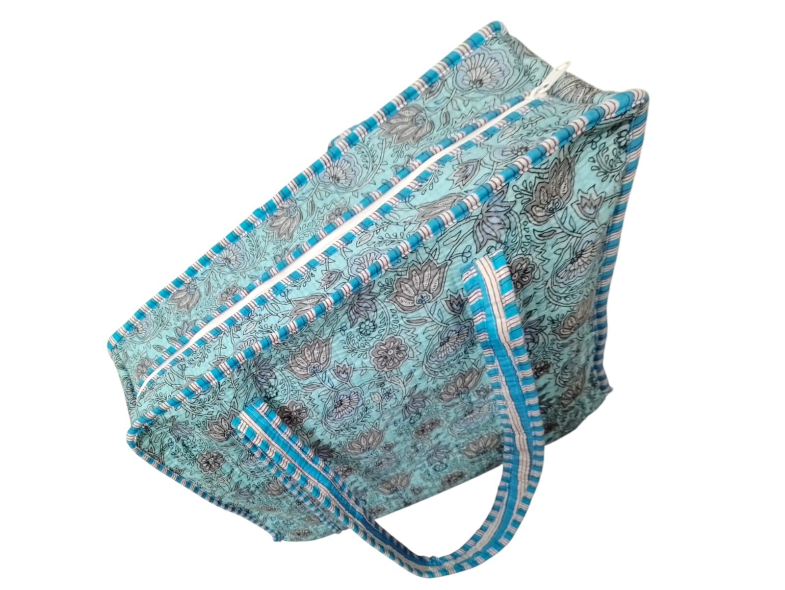 Lining Color: Blue Style: Tote Hardware Color: Baltic blue Handle/Strap Color: Baltic blue gtin13: Does not apply Finish: Quilted UPC: Does not apply Handmade: Yes Pattern: Handblock print Theme: Indian Exterior Material: Cotton Size: Large Bag Width: 18 in Country of Origin: India Exterior Color: Baltic Blue Occasion: Casual, Travel, Wedding Accents: Zipper, Stitching, Strap Accent Brand: handmade Vintage: No Features: Adjustable Strap, Inner Pockets, Pockets MPN: Does not apply Character: Hippie Shape: Square Hardware Material: cotton Lining Material: Cotton Closure: Zip Handle/Strap Material: Cotton Accessories: Bag Charm, Handle Keeper Department: Unisex Adults Handle Style: Shoulder Strap Bag Height: 18 in