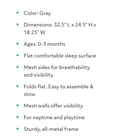 LIGHT & COMPACT: This infant bassinet is light enough to move room to room, or take on the road. Folds flat for easy storage and travel, includes a travel carry bag VISIBLE: The mesh walls allow for ample visibility for both children and parents COMFORT: The flat sleeping surface and sleeping pad cultivates comfort. Soft on skin SPACIOUS DESIGN: Assembled Dimensions 32.5"L x 24.5" H x 18.25" W STURDY & SAFE: meets all safety standards put in place by ASTM and JPMA. All steel frame