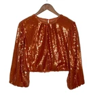 New With Tags Did notice a few sequins that are broken in half, but does not really affect the look of the top Pullover style with back keyhole button closure Bubble long sleeves with elastic cuffs Round neckline Blouson cropped elastic hem Fully lined 100% polyester Machine washable Approximate flat lay measurements: Shoulder to bottom hem length - 18" Pit to pit width - 19" Please compare measurements to something you already own to verify size and fit We are happy to answer any questions! We ship the next business day!