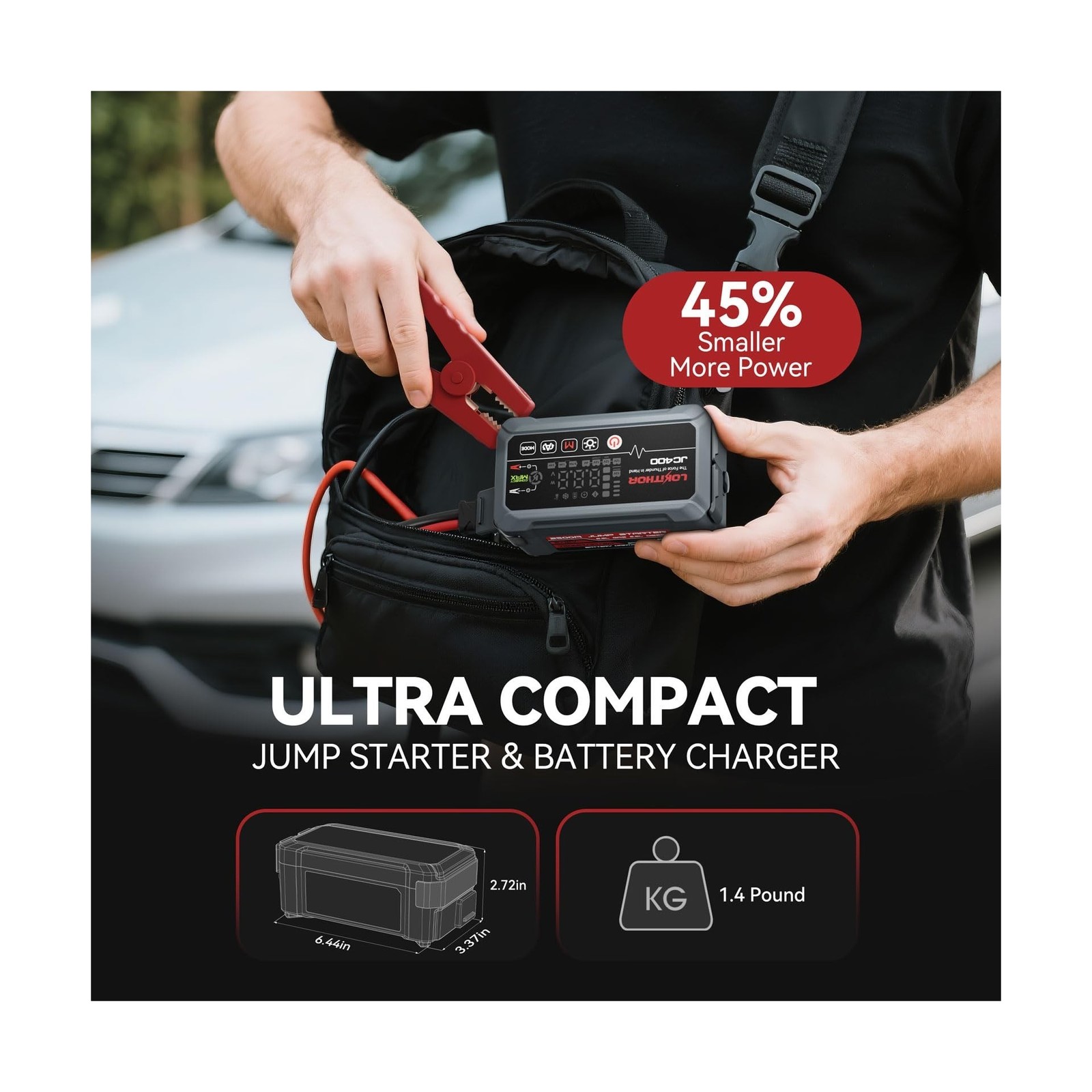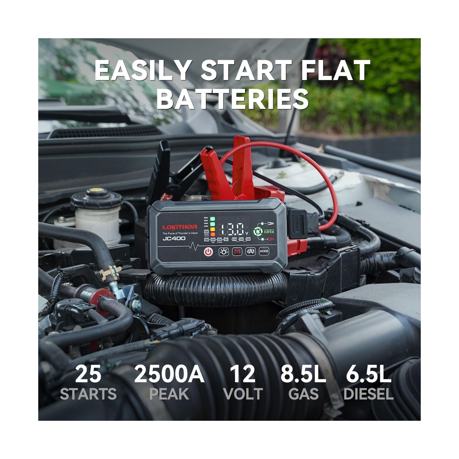 JC400 9-in-1 Battery Charger and Jump Starter, 2500A 12V Portable Jump Box for Car Upto 8.5L Gas/6.5L Diesel, 750mA/1A/2A, 6V/12V Automotive Battery Maintainer, Trickle Charger and Desulfator Description Features: 9-IN-1 CAR BATTERY CHARGER JUMP STARTER: JC400 car battery charger integrates 9 functions to meet all your automotive needs! it is a car jump starter, smart battery charger, battery maintainer, trickle charger, battery desulfator, voltage detection, portable power bank, and features 6-mode LED lights and a compass. This ultra- compact and versatile gadget is a must-have for emergency roadside emergency. Beyond it's multi-functionality and practicality, this jump starter battrey pack also achieves a minimized size to fit comfortable in the palm of your hand, ensuring effortless operation and flexible storage. POWERFUL AND SAFE JUMP STARTER: This car battery jump starter boasts a robust 2500A peak current, easily jump start 12V vehicles up to 8.5L gas or 6.5L diesel engines in seconds even in extreme temperature ranging from -4F to 140F. This battery jumper starter portable also equipped with automatically voltage detection and a BOOST start function. This car jumper starter portable can reliably jump start a low- voltage or completely exhausted battery. CHARGING WITH VERSATILITY AND PRECISION Unlike conventional chargers limited to a single output current, this automotive battery charger provide three optional output currents: 0.75A/ 1A/ 2A, catering to a variety of charging requirements. Portable car battery charger is compatible with a range of battery types, including 6V/12V regular battery,12V AGM and 12V lithium batteries. making it suitable for vehicles like cars, trucks, SUVs, motorcycles, lawnmowers, boats, and more. Its FORCE CHARGING function is particularly useful, enabling manual charging of batteries as low as 1 volt or even dead batteries, ensuring you're prepared for any situation. BATTTERY CHARGER,MAINTAINER & DESULFATOR: Battery Charging- Adopts a 7-stage charging programs for enhanced safety and efficiency Battery Maintainer- Trickle charge mode automatically shifts to trickle/float charge after full charge,maintaining battery health during winter and holidays. Battery Desulfator- Automatically detects and treats battery sulfation and stratification with pulse current technology, rejuvenating old or idle batteries and extending their lifespan. EXCLUSIVE CONNECTMAX TECHNOLOGY: Prolonged vehicle operation/parking leads to the accumulation of contaminants (oxidation/rust/oil/dust/weathering) on car battery terminals, resulting in poor starting problems. New users may experience poor connection between the clamp and the battery. LOKITHOR'S latest CONNECTMAX technology automatically detects impedance between the clamp and the battery. Enhanced starting performance by 30%, provide reliable and efficient jump starts every time. ENGINEERED FOR SAFETY: This portable jump starter for car features an integrated battery management system and smart self-identifying clips that automatically initiate 10 advanced protections. These protections safeguard both you and your batteries from improper use. The comprehensive suite includes Spark-Proof, Reverse-Charge, Over-Charge, Over-Current, Short-Circuit, Reverse-Polarity, Low-Temp, High-Temp, Over-Voltage, and Over-Load Protection. PORTABLE POWER BANK & LED LIGHT: This car battery maintainer doubles as a power bank with dual USB ports (USB-A and USB-C), allowing you to charge multiple devices at the same time, such as phones, laptops, and cameras. Its 80C high-rate battery ensures energy efficiency, with a minimal self-discharge rate of just 0.35mAh and an impressive standby time of up to 27 months on a full charge. Additionally, car battery recharger features a bright 300 lumen LED light with 6 modes ( 100% > 50% > 10% >Blink > SOS >Strobe), providing up to 12 hours of illumination for emergency situations. Ideal for nighttime roadside assistance and outdoor adventures. INTUITIVE OPERATION FOR SMART USERS: Experience the ease of use with our 12v smart lithium battery charger, featuring a 4.15-inch display that's visible even in bright sunlight. It shows charging status and battery voltage and allows you to monitor battery data in real time. Durable jumper cables to reach varied battery terminals, supporting multiple recharge cycles. The sturdy shell safeguards against damage from sun, rain, dust, and drops. Start your car with confidence every timeit's much easier than relying on another vehicle or roadside assistance! WHAT WILL YOU GET: Packing List: 9 in 1 car battery charger and jump starter 1; Jumper Cables1; AC Power Cord1; USB-A to USB-C Cable1; User Manual 1; Storage Bag 1 Brand Service: 1-Year Replacement Promise; 24h Service Support Product Details: Brand: LOKITHOR Product Dimensions: 3.37"D x 6.44"W x 2.72"H Item Weight: 1.9 Pounds Amperage: 2500 Amps Peak Output Current: 2500 Amps Brand: LOKITHOR Product Dimensions: 3.37"D x 6.44"W x 2.72"H Item Weight: 1.9 Pounds Amperage: 2500 Amps Peak Output Current: 2500 Amps Manufacturer: LOKITHOR UPC: 889551122016 Automotive Fit Type: Universal Fit Model: JC Series Item Weight: 1.85 pounds Item model number: JC400 Batteries: 1 Lithium Polymer batteries required. (included) Manufacturer Part Number: JC400 Date First Available: December 3, 2024 Delivery We Do Not Ship Outside of the Continental US. Return Policy All items qualify for returns within 30 days of receipt. Buyer is responsible for return shipping on any item that is not damaged. Feedback We take our reputation seriously, we buy and sell online, so we understand the value of trust. If you are unsatisfied with your order, please contact us and we will work with you to resolve it to your satisfaction.