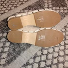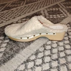 The J.Crew Size 8.5 Fuzzy Sherpa Mule Clogs are cozy and comfortable slip-on shoes with a wood sole and studded accents. These clogs feature a round toe, ivory color, and shearling fabric lining for added warmth. Perfect for casual occasions and travel, these clogs have a block heel style and are ideal for winter, fall, and spring seasons. With features like breathability and comfort, these J.Crew clogs combine style and practicality for a trendy and versatile footwear option.