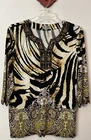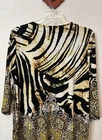 JM Collection presents a stylish Women's Brown Animal Print V-Neck Tunic Blouse in size Large. The blouse features a lively multicolor animal print, a comfortable 3/4 casual sleeve, and a flattering V-neckline. It is crafted from a soft blend of polyester and spandex, making it stretchy and comfortable to wear. The blouse is accented with beaded and rhinestone embellishments, adding a touch of glamour to the overall design. This easy-care top is suitable for all seasons and can be paired with different bottoms to create various looks. Length: 29 inches. Chest: 21 inches across laying flat.