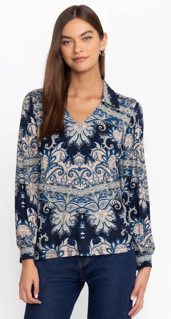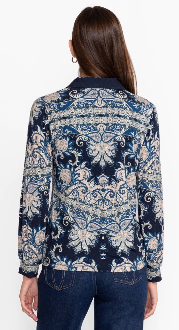 This is a Johnny Was Janie favorite puff sleeve polo in size small. It features a paisley pattern, long puff sleeves, V-neck or collared neckline, multicolor design with barbie character accents, made of spandex and rayon material. The fit is relaxed, suitable for all seasons, breathable, and easy care. This designer top has a geek and couture theme, making it a stylish and comfortable addition to a woman's wardrobe. This beautiful blouse can fit a size M.