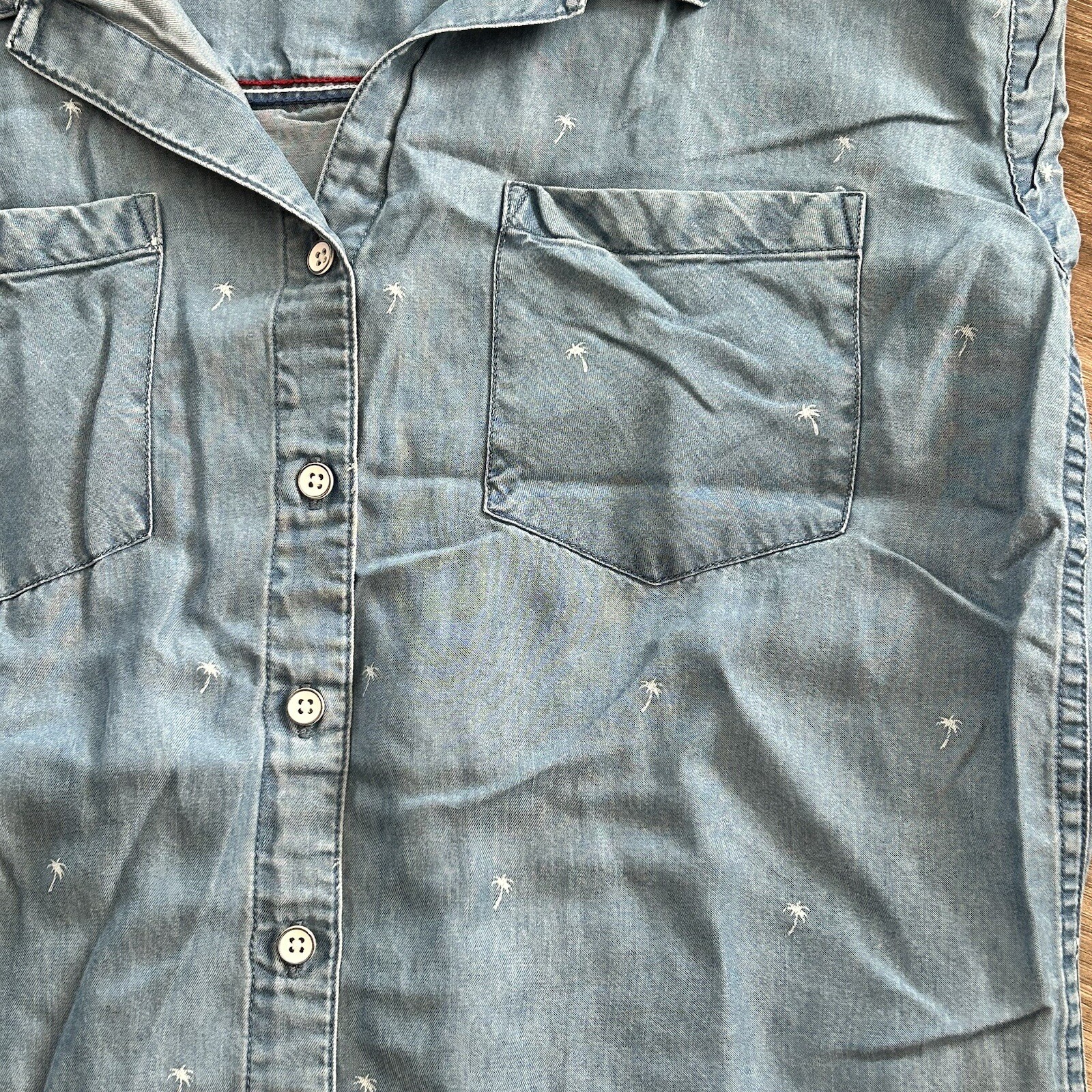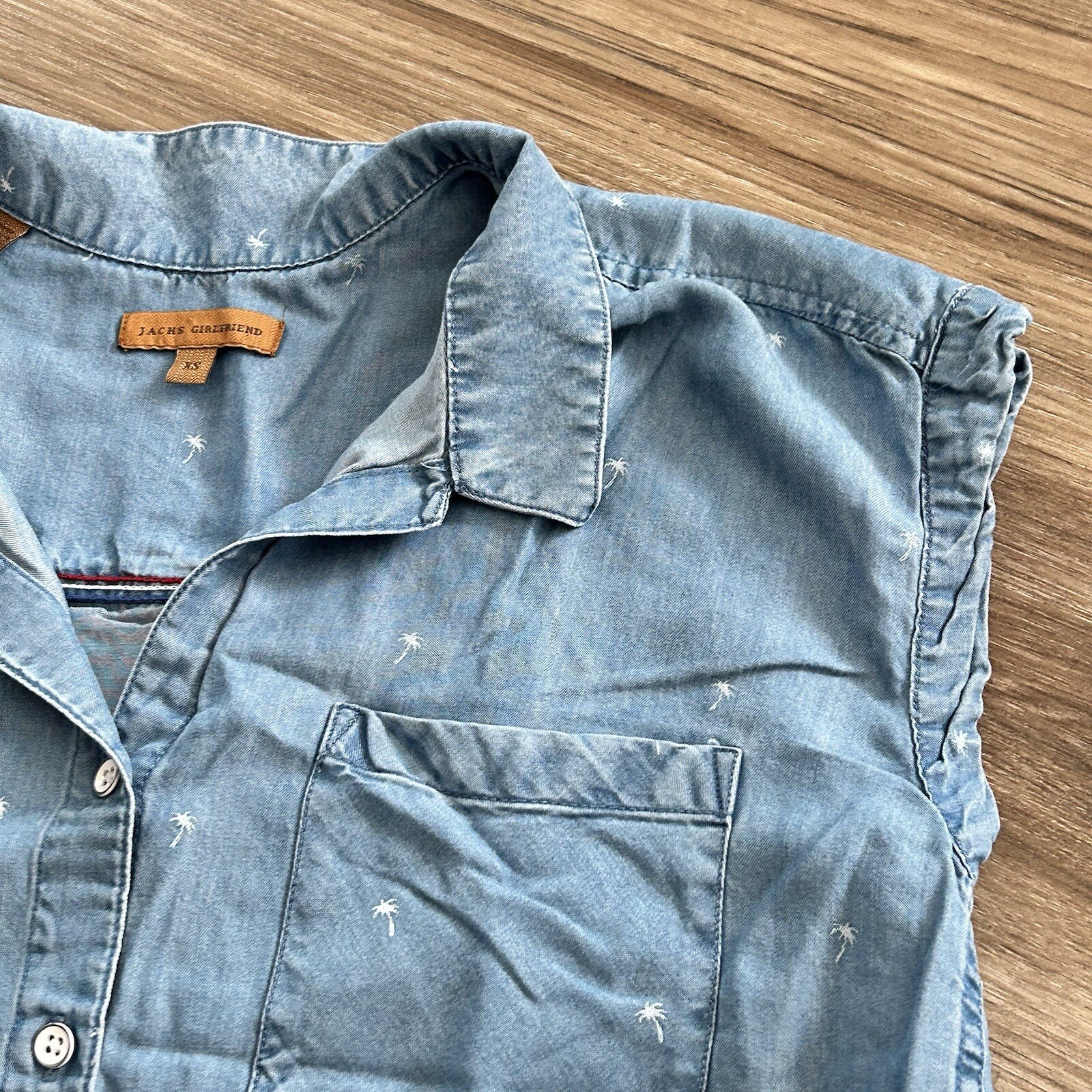 Jachs Girlfriend Blue Chambray Palm Tree Muscle Sleeve Button Up Shirt Women XS. Jachs Girlfriend Blue Chambray Palm Tree Print Muscle Sleeve Button Up Shirt Women XSmall in great condition/ non stretchy/ 2 front pockets and white buttons / curve Hem Pit to pit 19” across Length from shoulder 27” Approximate measurements #20 Casual, vacation,, boating, beachy all final sale