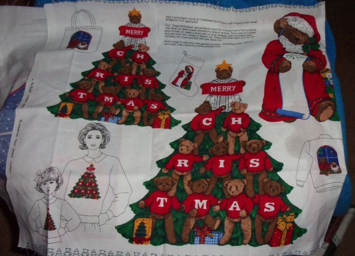 VIP Cranston Print Jingle Bells Bear Merry Christmas appliques Fabric Panel. It measures 43" x 18". It is new and uncut. This item is from a smoke free home. Please contact me if you have any questions. Thank you.