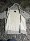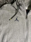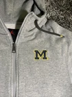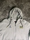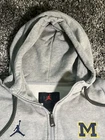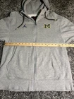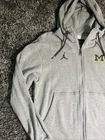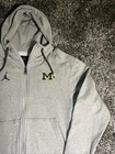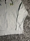 UM Michigan Wolverines Nike Brand Jordan Football Gray Zip-Up Hoodie Mens S EUC. This hoodie is perfect for any fan looking to show their support for the team. It features a full zip closure, embroidered logo, and pockets for convenience. The hoodie is made of a comfortable knit fabric blend of polyester and cotton, and is machine washable. With its long sleeves and hood, this hoodie is suitable for all seasons, making it perfect for football games or casual wear. The solid gray color and regular fit give it a classic look that will complement any outfit. This hoodie is part of the Nike Jordan product line and is a great addition to any fan's collection.