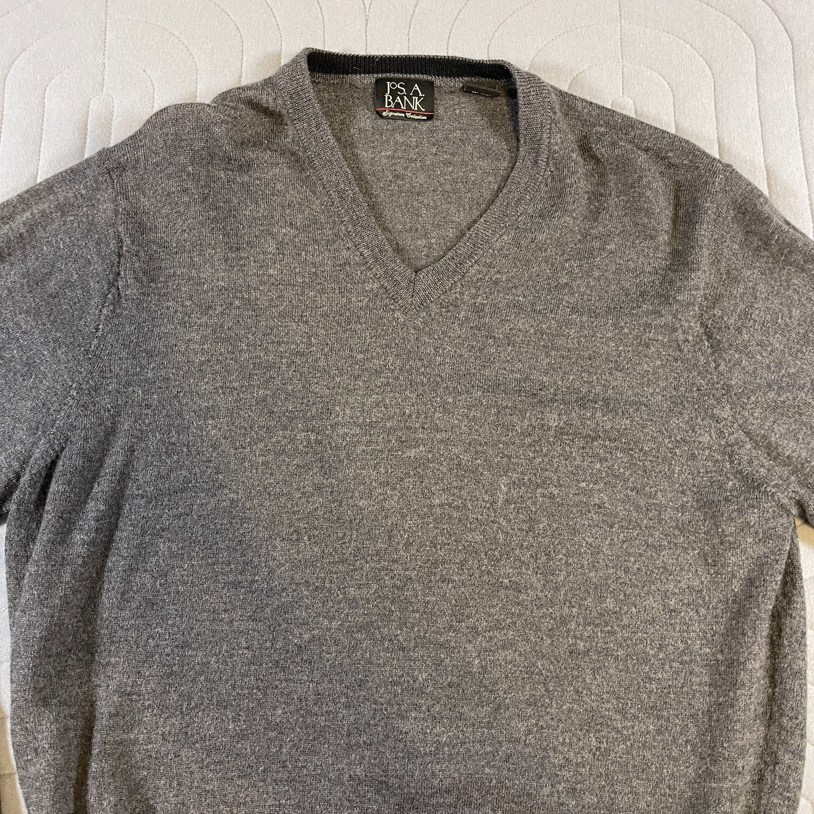 The product is a Jos. A. Bank men's sweater in size M from the Signature Collection, made 100% of Merino wool in gray color. This sweater features a V-neckline, long sleeves, and a tight-knit design, making it suitable for travel and casual occasions. It is a classic pullover style with a regular fit, making it a versatile and stylish clothing option for the winter, fall, and spring seasons. Perfect for men looking for high-quality and timeless sweaters.