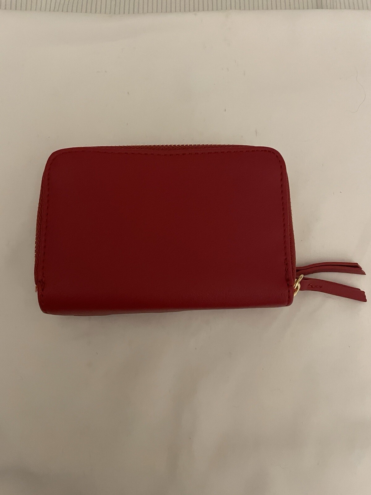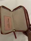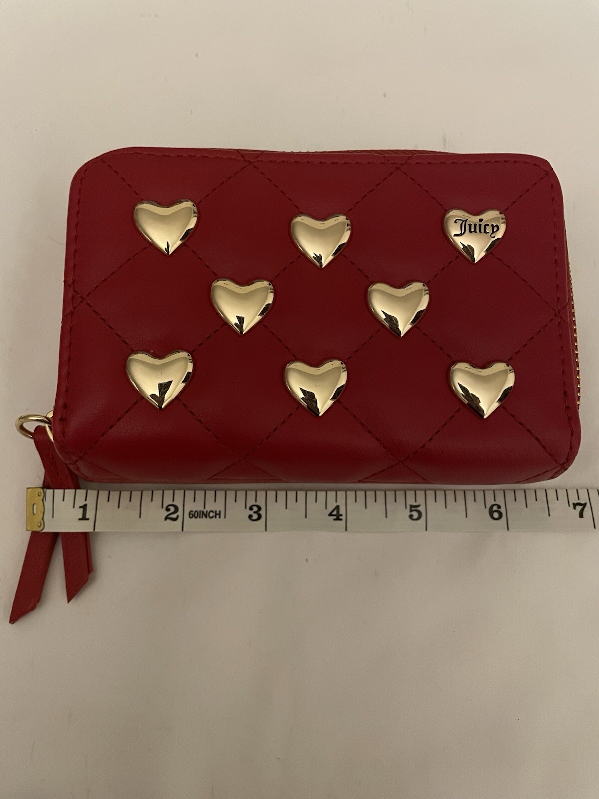 This Juicy Couture wallet is a stylish and functional accessory perfect for any woman. With its vibrant cool red color and solid pattern, it is sure to catch the eye. The wallet features quilted and studded heart accents on the front, along with a logo accent and zipper. It has a double zip around compartment, allowing for plenty of space for credit cards and other essentials. The wallet is made of faux leather with polyester fabric type, and has a folding design with gold tone hardware. The wallet is one size fits all and was manufactured in Vietnam.