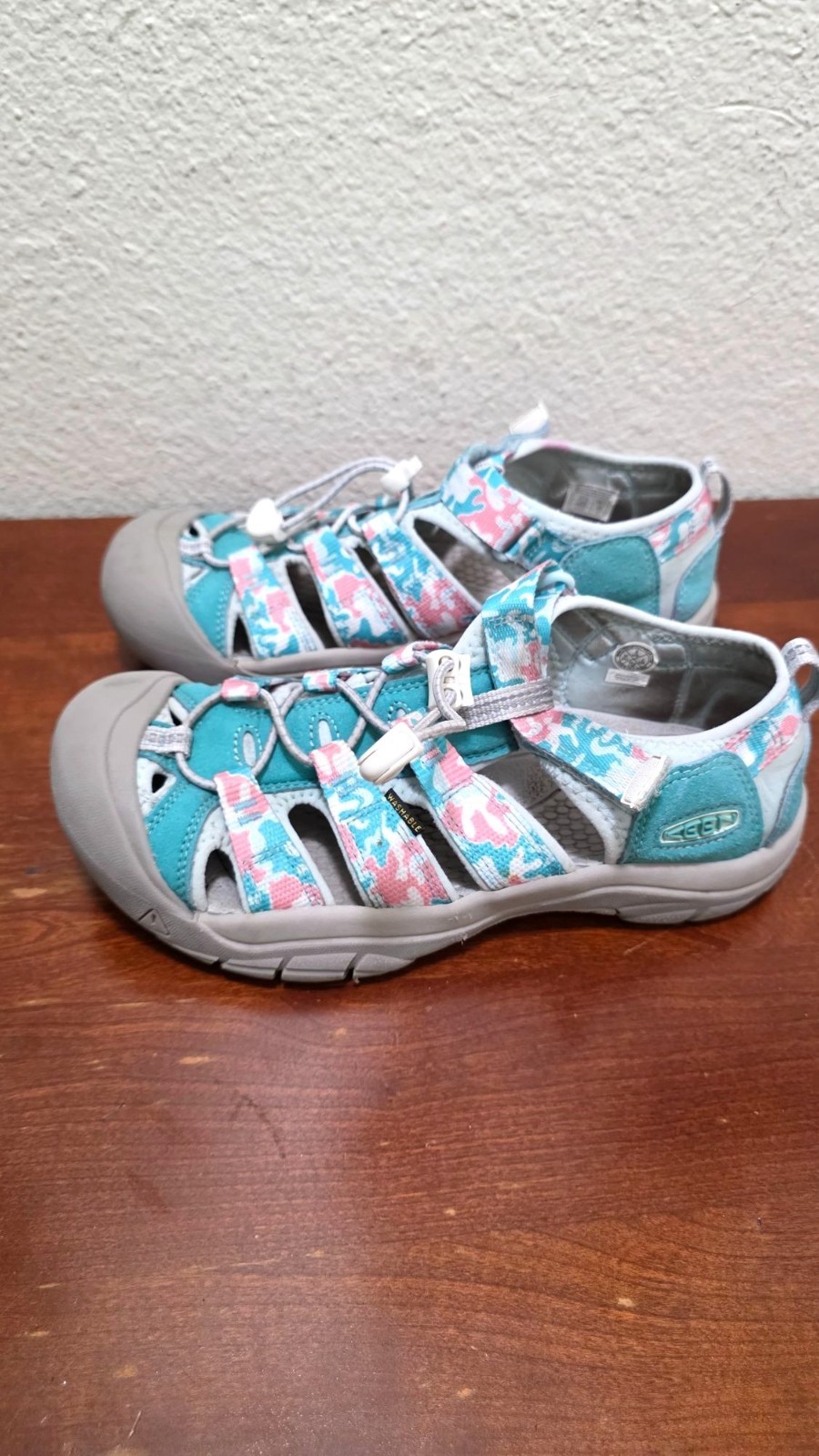 Durable and stylish, these Keen Newport H2 sandals feature a vibrant teal and pink camo design. Ideal for kids' outdoor activities with secure fit and comfort. • Adjustable hook-and-loop strap for a secure fit • Non-marking rubber outsole for enhanced grip • Washable polyester webbing • Quick-dry lining for active use • Pull-on secure lace system CONDITIONS pre owned, Slight wear on soles and straps, good conditions. see photos for more details.
