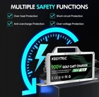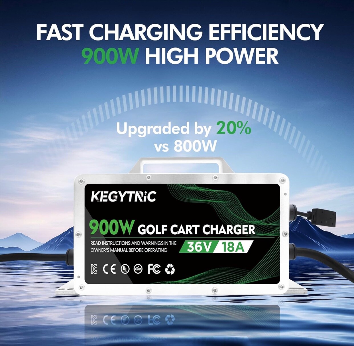 #1221 Golf Cart Battery Charger, 18 AMP 36 Volt for EZGO TXT with D Style Plug Lead Acid Battery, 900W Quicker Charge EZGO Golf Cart Charger, IP67 Waterproof, Fast Heat Dissipation, Durable Shell Brand: Kegytric Color: Green & Black Product Dimensions: 11.02"D x 3.35"W x 5.51"H Output Voltage: 36 Volts Input Voltage: 110 Volts Current Rating: 18 Amps 【 Make Golf Cart Charger Great Again 】 1400W higher power, faster charge. 18 Amp 36 volt Golf Cart Charger for EZGO TXT with a D style plug. The charger is designed with a one-piece plug and uses a more abrasion-resistant, heat-resistant rubber cord. Fast and safe charging even in cold winter conditions. 【 IP67 Waterproof & Dust 】 The 36 volt golf cart battery charger is IP67 rated and keeps out dust and water spray in the rain and other inclement weather. Improve the service life and performance of lead-acid batteries. 【 Trickle Charger, Multiple Protection 】 The green light is always on when battery charging is complete and automatically cuts off the power supply. Integrated protection against temperature, low voltage, overvoltage, short circuits, and electrostatic sparks. You don't have to worry about safety when charging 【 Handheld Design & Longer Cable 】 Portable handheld design for easy access. Golf cart charger with a 16-foot fast charging cable, and a longer charging cable to avoid tangling, which can effectively protect the charging safety. 【 Fast Heat Dissipation 】 Aluminum alloy shell and external cooling fan allow the 36 volt Ezgo golf cart charger to dissipate heat quickly, making it safe to charge. The cooling fan is located on the side to prevent hand burns from residual heat in the cooling area when handheld. 【 Safety & High Quality Assurance 】 The Ezgo charger is made of a high-quality durable aluminum alloy case.