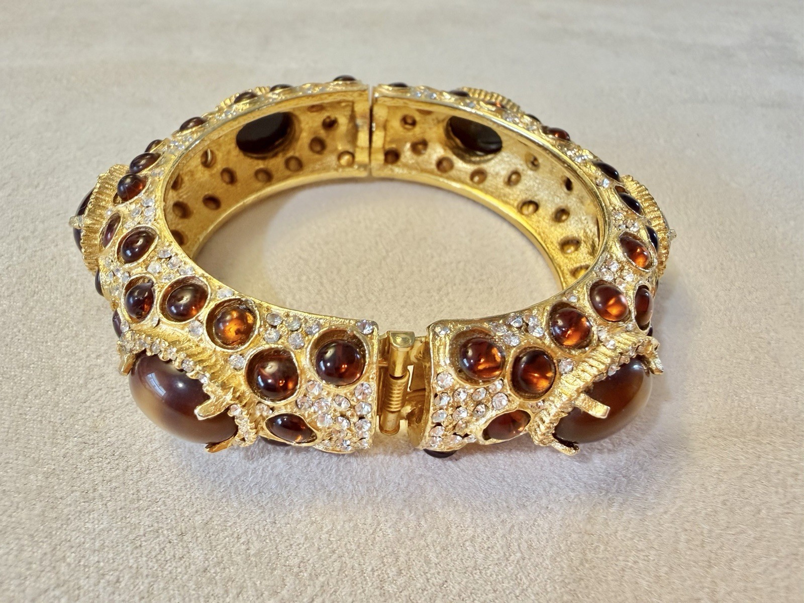 The Kenneth Lane KJL Vintage 1960s Jewels Of India Mughal Cabochons Bangle Bracelet is a stunning piece of vintage jewelry featuring Mughal cabochon stones set in a bangle style bracelet. The rich history and intricate design of this bracelet reflect the brand's commitment to creating high-quality and unique pieces. Perfect for adding a touch of vintage glamour to any outfit, this bracelet is a timeless accessory that speaks of elegance and sophistication.