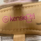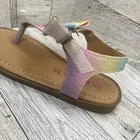 These Kensie Girl Rainbow Bow Flat Sandals are designed for girls in size 9. The flat style and faux leather material make them comfortable for walking, perfect for everyday use. Additionally, the rainbow accent adds a playful touch to the design, making them a fun and stylish choice for young girls.