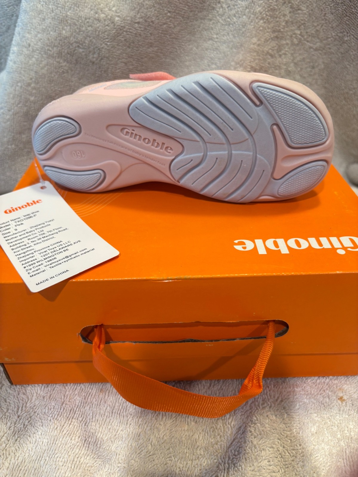 The product is a pair of athletic casual kids toddler shoes in pink, designed specifically for girls. These sneakers are from the brand Ginoble, very comfortable with velcro strap. Perfect for casual occasions, these tennis shoes offer style and comfort for active young girls on the go. Size 9 and size 11 available.
