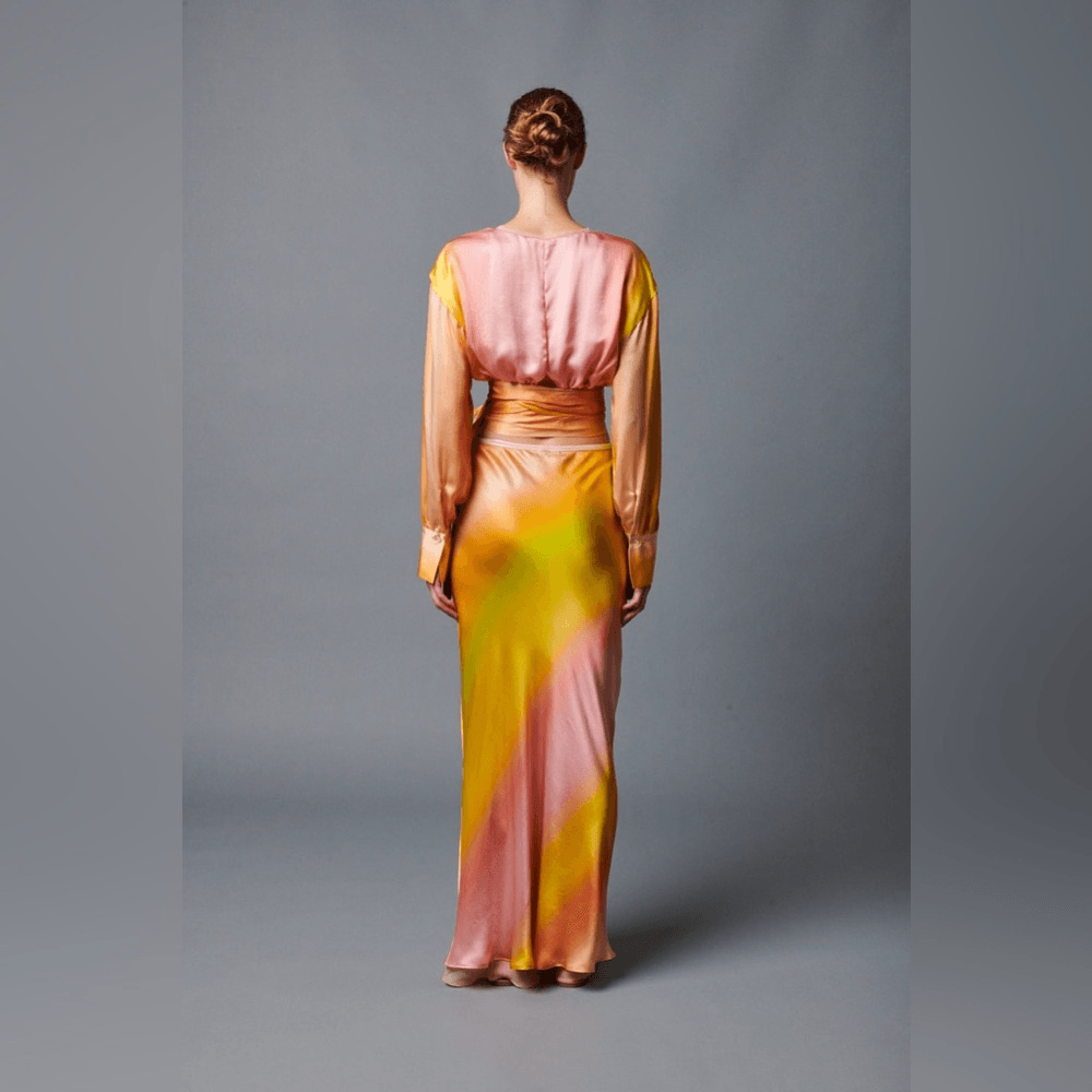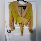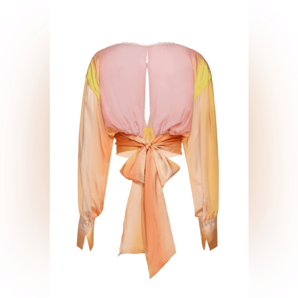 LE SUPERBE DE LA SOL BLOUSE NWT size small NWT The stunning ombre sunset color palette, with warm tones of orange, pink and green, adds a touch of vibrancy. With a stylish deep v neck and comfortable long sleeves, this blouse is both chic and versatile. The large bow tie detail adds a polished and sophisticated touch. Tie Front Top Long Sleeve 100% Viscose Dry Clean Only Model is wearing a size small Model Measurements - Height: 5'10 1/2", Bust: 31", Waist 23 1/2", Hips 35 1/2"