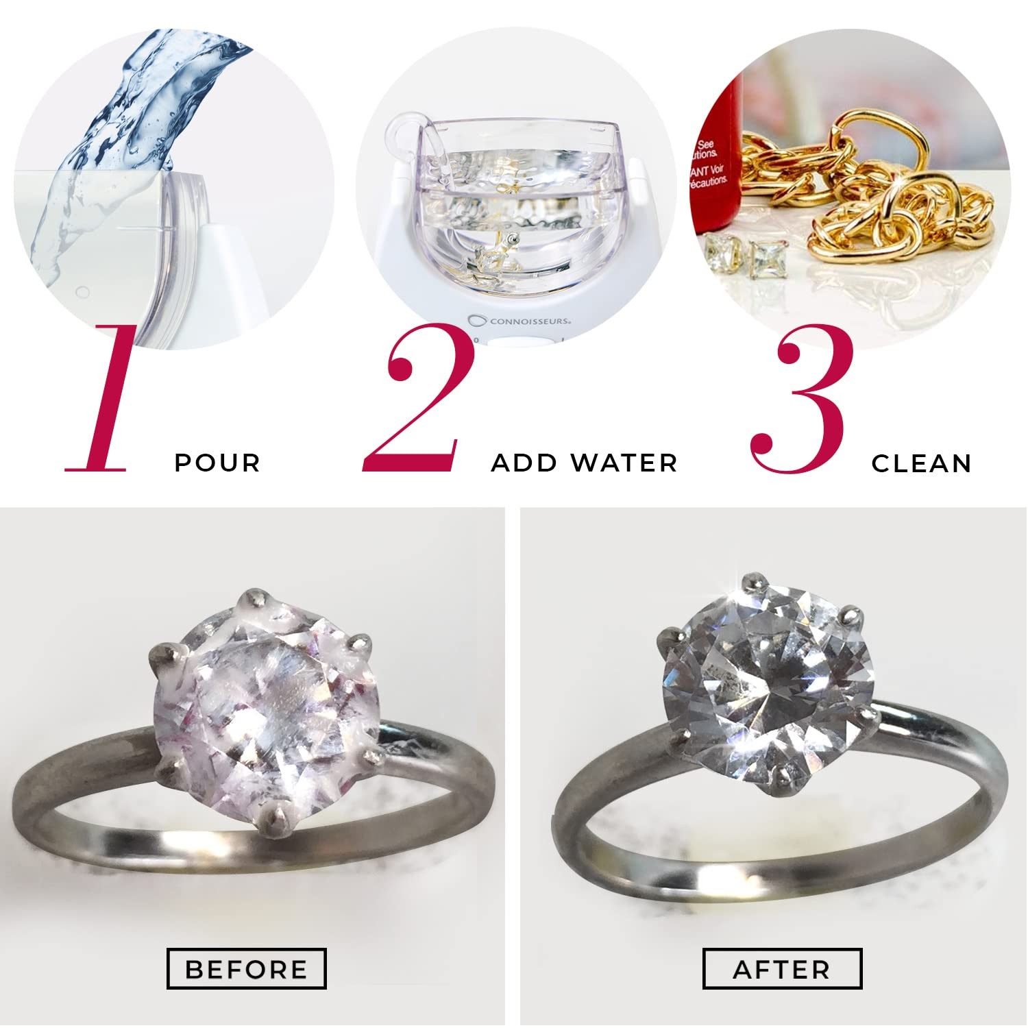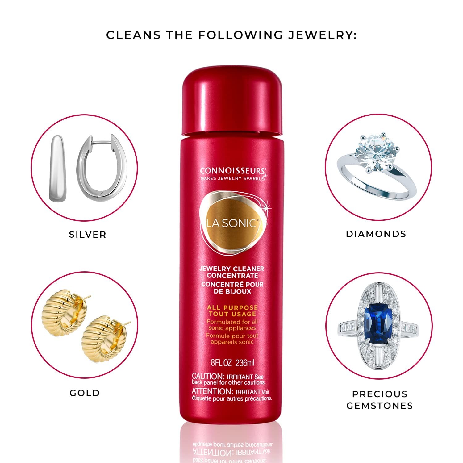 LASONIC JEWELRY CLEANER SOLUTION: Formulated for LaSonic SafeWave twin-tank, LaSonic Diamond Dazzler, and all Ultasonic machines, this ammonia-free formula safely cleans and polishes all types of jewelry, from precious stones to costume jewelry SPARKLE-READY JEWELRY: Each 8-ounce bottle creates a half-gallon of deep-cleaning solution when diluted; Store it near your LaSonic system for quick, effortless shine anytime BATHE IT BEAUTIFUL: Our sonic cleaning devices are the ultimate in professional beauty cleaning, designed for at-home use with our LaSonic Concentrate jewelry cleaning solution FIND THE PERFECT CLEANSER: We've got everything you need to keep rings, necklaces, earrings, and bracelets gleaming, from dip, gel, foam, or drop Connoisseurs jewelry cleaners to sonic cleaning devices and polishing wipes or cloths THE GOLD STANDARD IN JEWELRY CARE: Connoisseurs is the world leader in jewelry care; We believe it's an essential part of every woman's beauty routine, which is why our jewelry cleaning products make it easy to take care of your pieces
