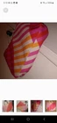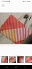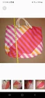 Orange, pink and white tote great for beach or pool. Very large. Orange lining inside in perfect condition. Rope shoulder strap. Some wear on bottom which is pictured. A little dirt spot on handle which is also pictured.