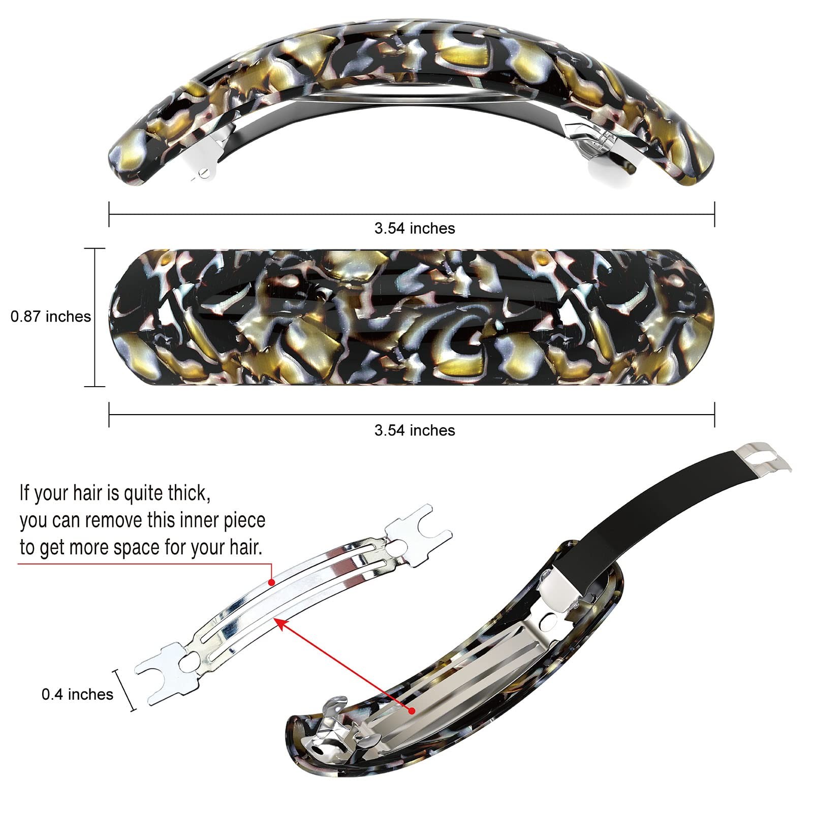 【Fashion Hair Ornaments for women daily use】 Barrettes come with 3Pack of 3 beautiful colors, they are Black, Brown Onyx, Green. Women Hair clips with removable inner bar, great for thick hair without springing apart. 3.6 inch large barrettes works for long, short, thick, thin, curly or straight hair perfectly ! " 【Applicable Hair Styles】 Ponytail, half-up, half-down and more." 【Stylish and Functional Hair Accessories 】 Simple French Design hair clips, elegant and easy to create new look. Give your hair a gentle hold that looks great with hair barrettes. Item Features Material: Cellulose Acetate, Steel Clip Color: Blue + Brown Onyx + Black Style: Trendy, Elegant, Stylish, Classic Size of hair clips Length: 3.5'' / 9 cm Width: 0.86 '' / 2.2 cm Height: 0.86 '' / 2.2 cm Bottom clip length: 3.2"/ 8.2 cm Package Contains : 3 x Hair Barrettes 【Stay in Place】hair barrettes are designed to firmly hold your hair in place without slipping or sliding, keeping your hairstyle intact all day long. 【Beautiful Colors and Styles】Available in a range of attractive colors and styles, these barrettes will give you the perfect finishing touch for any occasion or outfit. 【Suitable for All Hair Types】Whether you have thick, thin, curly or straight hair, simple barrettes work well on any hair type, making them a versatile hair accessory for women in any age. 【Comfortable and Non-Snagging】Constructed with a larger size and comfortable material, sturdy barrettes keep your hair in place without causing any discomfort, tangles or snags. 【Great Gift Idea】Classic hair barrettes make a perfect gift for women of all ages, and are sure to be appreciated for their beauty, quality and convenience.