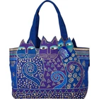 Description Cat lovers everywhere will love this shoulder tote with it's very rich looking colors, of blues, purples, and golds all over! Not to mention the picture of the three adorable cutout cats that line up in the front of the bag with their tails curled up in delight. Measures 20" x 5" x 14.5" Zipper top closure Inside pockets Water resistant interior Reinforced bottom panel