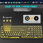 ▶【Large Print Keyboard】: Effortlessly locate any key on our large key keyboard. It is designed with print 4x larger than on traditional keyboards to help you type confidently. Ideal for seniors, students, office workers, elderly, the visually impaired, schools, special needs departments and libraries, as well as companies. ▶【7 Color Backlight】The Backlit keyboard has 3 levels of brightness, 7 different colors, and 2 backlight modes.Backlit can choose to turn on/off and adjust brightness, making it more convenient to type in low-light environments. Bright and evenly distributed backlit keys, easy typing in lower light environment. ▶【Full Size & Ergonomics Design】:Full Size light up keyboard layout with numeric keypad, Large Print keys provides superior comfort without forcing you to relearn how to type. Ergonomic keyboard layout reduces wrist fatigue and discomfort during prolonged use. ▶【Blending Retro With Fashion】: A sleek, modern design with round raised keycaps and spill-resistant technology, this typewriter keyboard helps you stand out in the office. It can showcase its unique charm at home, school,studio, and office. ▶【Plug and Play & Wide Compatibility】: This USB keyboard takes away the hassle of power charging or swapping out batteries and is easy to setup.No drivers required.Our keyboard compatible with windows XP/Vista/7/8/10/X,Mac and other operating system. Works well with desktops, Chrome-book, PC, Laptop, Computer and more. ▶【Comfortable Typing & Silent Click 】: The effortless crater mechanism under each key makes typing more comfortable. The keyboard are almost silent, don't worry about disturbing others. ▶【After-Sales Service】: Enjoy 24 months of support.Buy with confidence.If you have any issues,let us know,and we will resolve them within 24 hours. Product Description 1 Large Print Backlit Keys 2 Ergonomic Design 3 Especially Nice to People 4 Large Print Keyboard 12 Multimedia Shortcuts This Full-size large print backlit keyboard with 12 multimedia shortcuts, can provide you with the best entertainment experience. Plug and Play This USB keyboard takes away the hassle of power charging or swapping out batteries and is easy to setup. No drivers required. Backlight Retro Round Keys Bright and evenly distributed backlit keys, easy typing in lower light environment. Backlit can choose to turn on/off and adjust brightness. Wide Compatibility Compatible with Windows 2000/XP/7/8/10, Vista,Raspberry Pi 3/4, Mac OS. Works with your PC, laptop. How can I adjustable the Large letters keyboard backlit? Press Set key :Turn on/off backlit and adjust 7 colors FN+PD : Reduce backlit brightness FN+PU : Increase backlit brightness FN+Set key : Breathing light mode The font of this keyboard seems to be larger than that of ordinary keyboards? The design of this large font keyboard can display the letters on the keyboard more clearly. 4X larger than standard keyboard fonts, clear and easy to read, and can really help those who have trouble seeing keyboards. Can I still see easily and type normally when using the keyboard at night? Yes, the fonts are large enough and the backlight can be turned on so we can see in dim environments. Backlit design, protect your eyes , make you can typing in the dark easily. Could I lock the keyboard function when having a pet at home to avoid it causing trouble? Locking the keyboard involves holding down both the Fn and F11 keys together. Once locked, the keyboard will be rendered inactive. To regain functionality, simply press the Fn and F11 keys once more or reinsert the USB cable. Is it easy to slide when using it? The bottom of the keyboard has an anti-slip design to ensure it won't slide on the desktop.