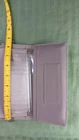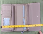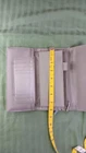 Patent leather Black and white floral design There are sections for your cards, pics, checkbook, and change. The change compartment is zipper The tri-fold is a snap button Only flaw is some yellow tinge on the exterior back and a little on the front. Hardware is hold tone