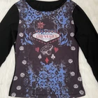 Las Vegas Bedazzled Long Sleeve Top with Dice and Playing Card Design Size M No Brand 65% Cotton 35% Polyester It has a small imperfections in the fabric and the stitching of one sleeve is coming undone by the hand (check pictures) #lasvegas #bedazzled #rhinestone #y2k Approximate Measurements (straight across): Pit to pit 16” Length 20” 5.2