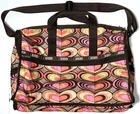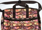 LeSportsac Pink Brown Hearts XL Duffle Travel Weekender Overnight Carryall Bag With Double Handles and Adjustable Shoulder/Crossbody Strap. Has 3 outside zipper pockets. Measures: 20.5" L x 13" H x 10 1/4" D. Great gently used condition with some spots on the inside, see pics.