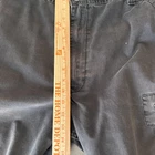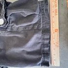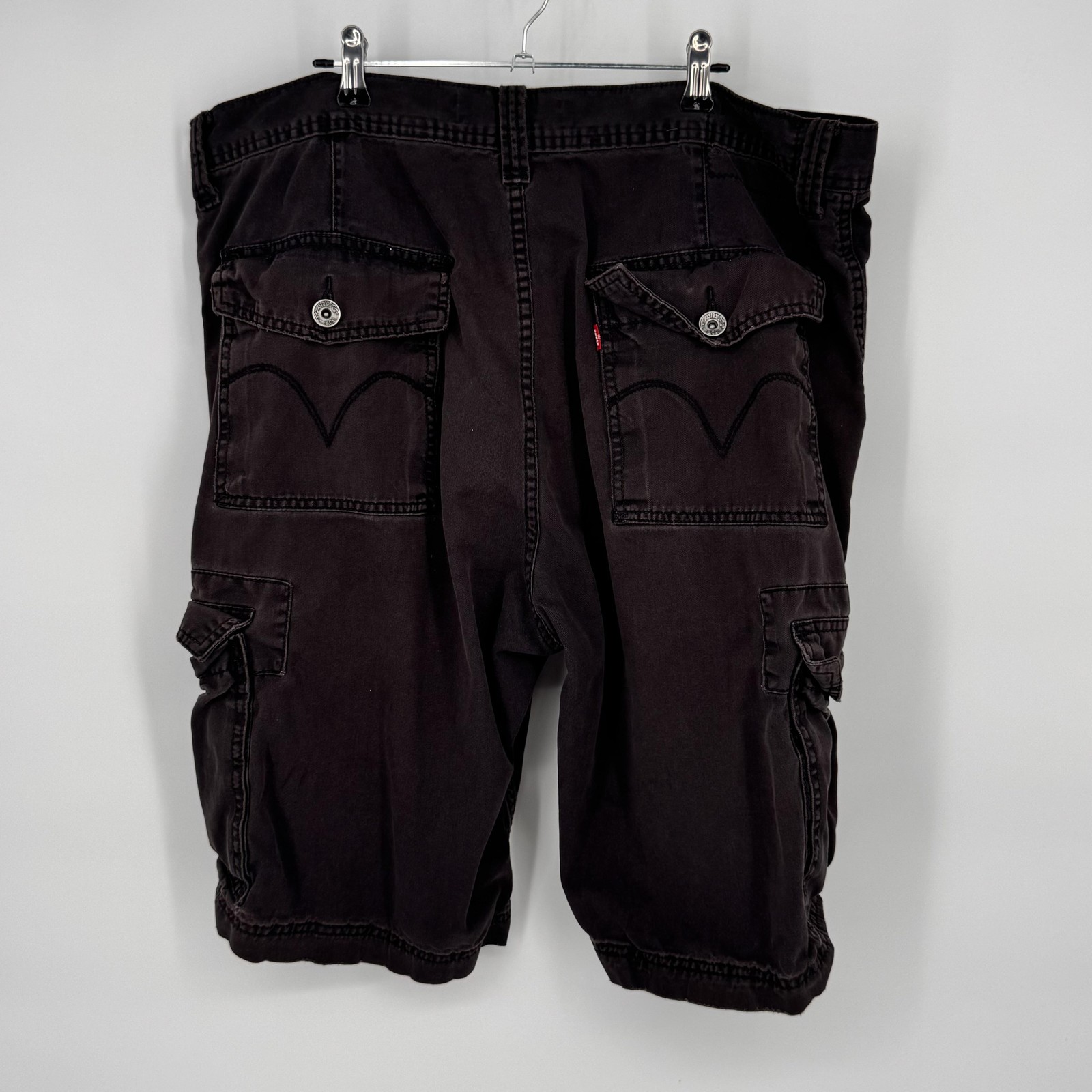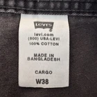 Levi's Cargo Shorts Mens 38 Dark Gray Cotton Pleated Pockets Casual Utility Pre-owned cargo shorts with moderate wash wear and fading throughout. Several small light spots on the front leg and near the hem plus minor seam wear at the seat, all shown in photos. Fabric, stitching, and hardware remain intact with no holes or structural damage; interior tags are present. Brand: Levi's Style: Mens cargo shorts with pleated front and multiple utility pockets. Color: Dark gray solid wash. Size on tag: W38 (mens regular fit). Material: 100% cotton twill. Country of origin: Made in Bangladesh. Interior label details: , (800) USA-LEVI, style designation CARGO. Details: Zip fly with button closure, belt loops, front slant hand pockets, large flap cargo pockets on both legs, rear flap pockets with button closures and signature arcuate stitching, Levi Strauss & Co. branded metal buttons, and Levi's red tab at back pocket. Casual utility cargo short style suitable for everyday wear, work, or outdoor activities. Note: Shows some small light spots and areas of seam wear as pictured. 112615