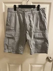 Levi's cargo shorts for men in size 34, featuring a solid green color and made of cotton. These casual shorts have a zip closure, flat front, and cargo pocket style with an inseam of 8 inches. The shorts are designed with a medium fabric wash and a regular fit, suitable for outdoor activities. The brand is Levi's, known for its quality and style.