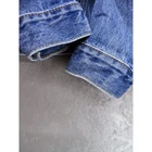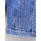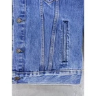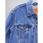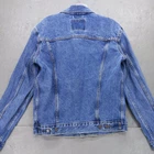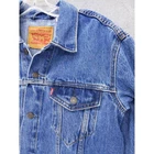 Classic Levi's denim trucker jacket in medium wash blue. Features traditional styling with button front closure, two chest flap pockets, and side hand pockets. Collar and long sleeves with button cuffs. Made from sturdy denim material with signature contrast stitching. Measurements: 22" chest, 22" shoulder to hem, 34" center neck to cuff. Perfect representation of the iconic Levi's trucker style. Good condition with no damage, stains, or heavy wear. Please compare the measurements to something you already own. Quick shipping from an experienced seller.