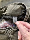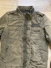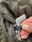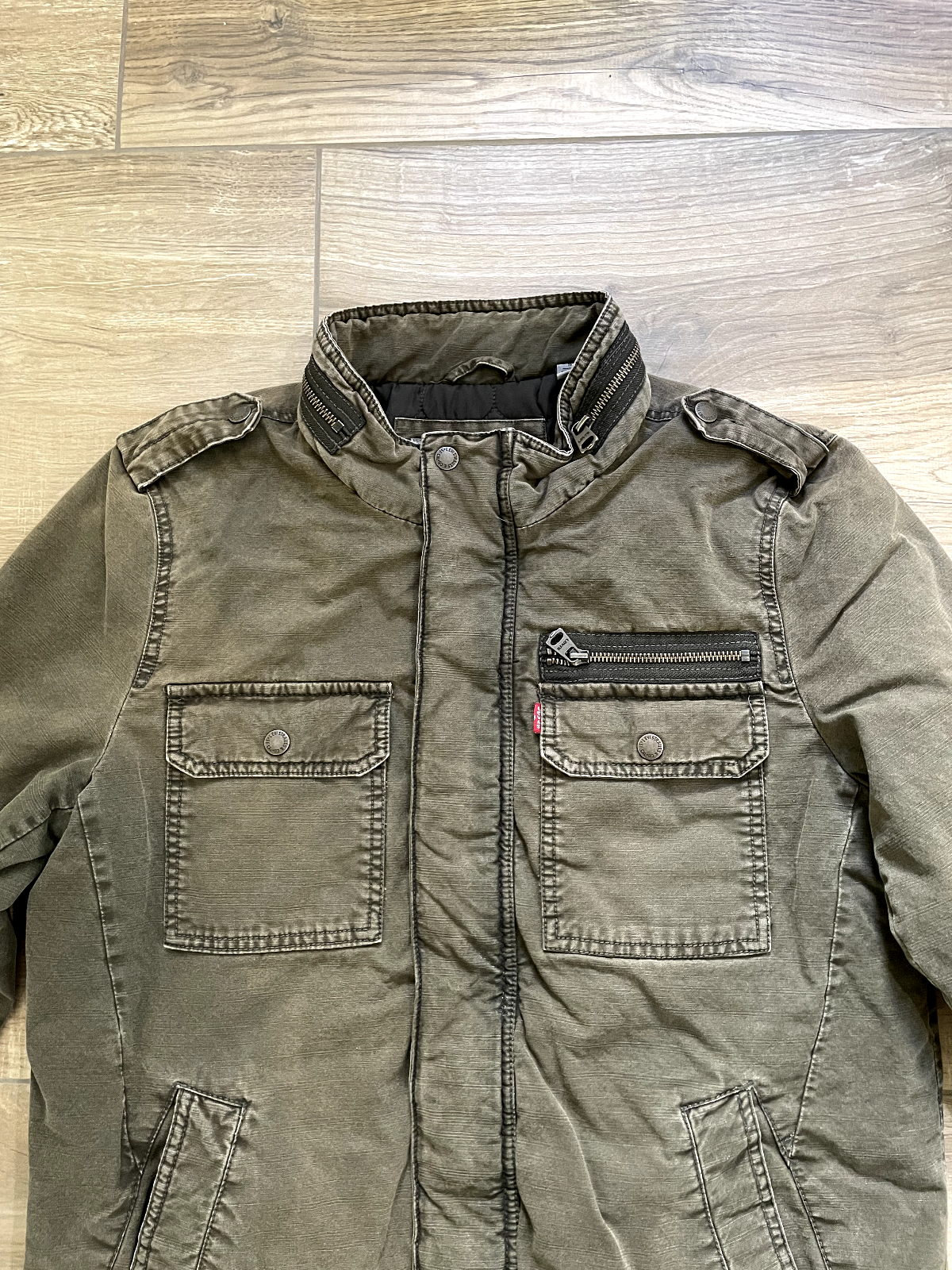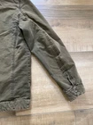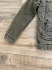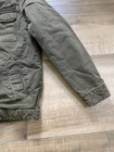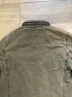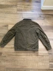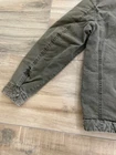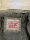 Levi's Trucker Jacket Style: Full zip canvas short casual chore jacket Color: Olive green khaki Features: Full zip with snap over, snap and zip pockets, quilted lining Fabric: Shell 100% Cotton, lining/ knit/ fill 100% poly Approximate flat measurements: Pit to pit 22", Length back neck to hem 27", Sleeve 25" Condition: Preowoned with general wear and fading Tag Size: S Cleaned per Ebay Standards