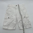 Levi's San Francisco Shorts in white, size W28 for men. These relaxed-fit cargo shorts feature a button closure and a light wash fabric. They have a cargo pocket with a logo accent and are made of cotton. The shorts have a zipper closure and are designed for casual wear, perfect for a spring outdoor theme. Made in Vietnam. Check pictures for flaws and measurements