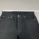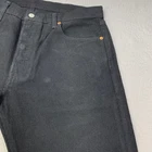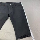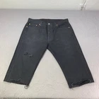 Levis Shorts Denim Black 501 34 x 15 Modern Red Tab Button Fly Thrashed Color---Black Stains or Holes---Has been cut and legs are different lengths. No stains Actual Measurements--- Please see pictures for actual measurements Please check out my other listings and bundle for a better price and shipping discount.