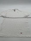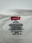 This is a Levi's women's T-shirt in size Large, white color, with a solid logo design. It features short sleeves, a round neckline, and a pullover closure. Made of cotton material, this regular fit T-shirt has a basic style with a classic theme. It is easy to care for and was manufactured in India. *Check the images above for the flaws and measurements of the item.