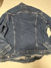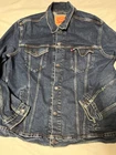 Crafted for comfort and style, the Levi's Trucker Jacket in men's size 2XL is a classic staple for any casual wardrobe. The dark wash blue denim jean material provides a rugged, yet refined look that's perfect for a range of occasions, from weekend outings to relaxed work environments. The jacket's solid color and subtle logo accent on the back pocket add to its timeless appeal. Key features like a collared design, stretch fabric for ease of movement, and multiple pockets for convenience make this jacket an ideal choice for fall, spring, and winter seasons. Its machine washable cotton lining ensures easy care, while the regular fit promises a look that's not too tight or too loose. The jacket closes with classic buttons, sealing the deal on this everyday essential.