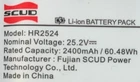 Li-ion battery, scooter, Lithium-ion Battery Pack, 10INR/19/66-2, Lithium Ion Battery PACK, Rated Capacity: 2400mAh / 60.48Wh, Voltage: 25.2V, Fujian SCUD Power, SCUD Li-ion BATTERY PACK, Manufacturer: Fujian SCUD Power, Li-ion BATTERY PACK, Model: HR2524
