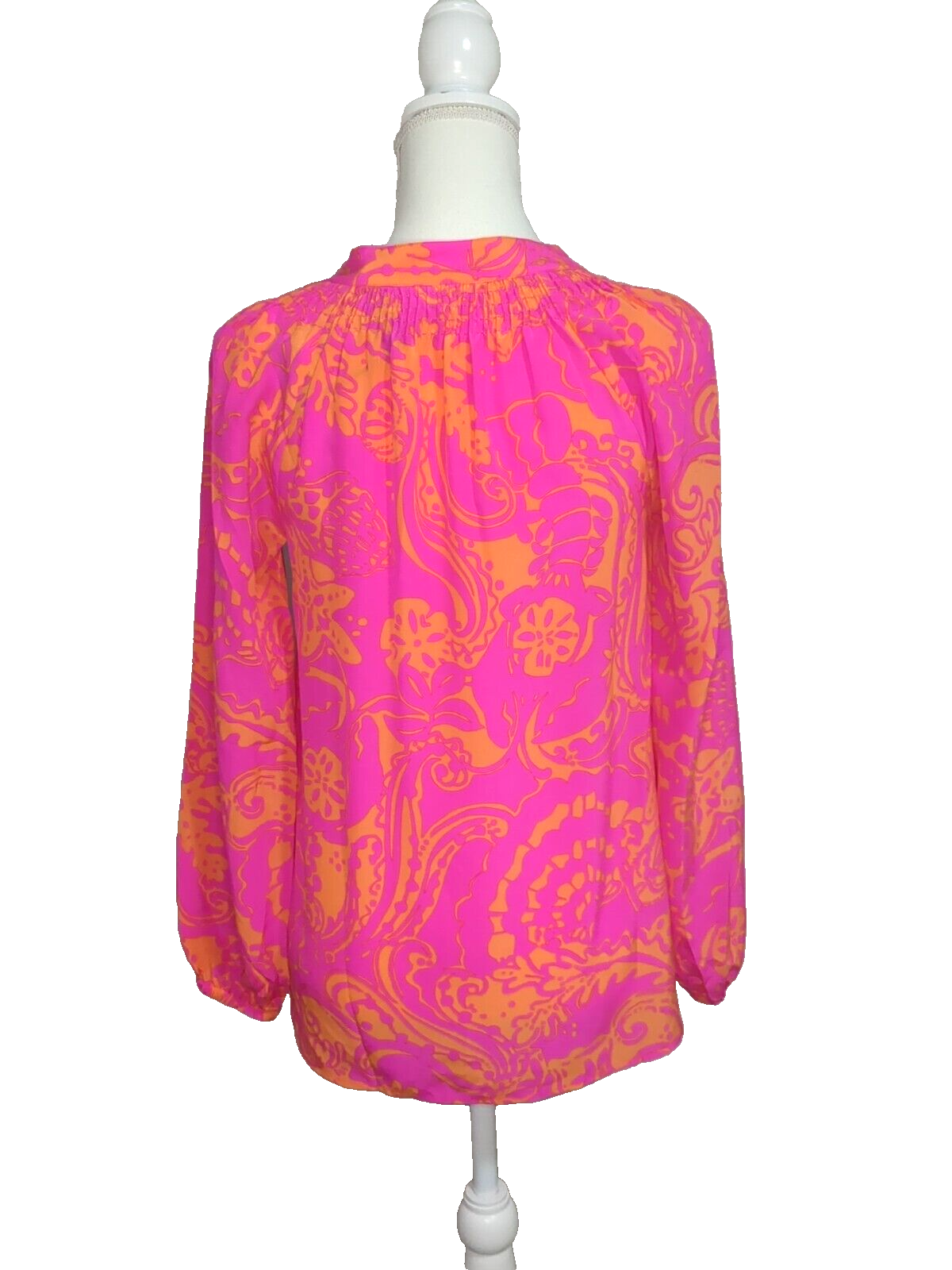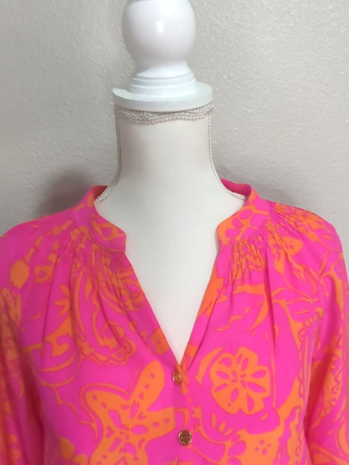 This blouse is absolutely stunning! The silk feels luxurious, and the Pop Pink color is vibrant yet elegant. The fit is perfect for an XS, with just the right amount of flow. Super lightweight and breathable—ideal for summer. The seller shipped quickly, and the item arrived in pristine condition, just as described. Love the Lily Pulitzer details—so chic! Would definitely buy again.