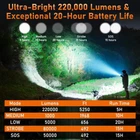 🔦【220000 Lumens Flashlight】high lumens flashlight max output up to 220000 lumens, several times brighter than ordinary flashlights.Projects a wide beam of light that clearly illuminates things within 200 square meters, easily lighting up an entire room or backyard.with a maximum illumination distance of up to 3,280 feet.It can be easily used in various situations such as camping, hiking or emergency. 【Flashlights High Lumens & Long-Lasting】Excellent flashlights that can perform consistently day in and day out, included long-lasting rechargeable power which allows for an impressive 12 hours runtime while still maintaining optimal brightness.This feature of led flashlight is particularly useful when power sources may be scarce. 【Quick Charging & Power Displays 】The rechargeable flashlight features power displays and equipped with a fast charging cable, being able to quickly charge the flashlight in just 3 hours by using various power sources like a car charger, power bank, computer, or USB outlet.Provides a more efficient and environmentally friendly option. 【Water Resistance & Durable 】flashlight is made with high-quality materials that are durable and weather-resistant. Flashlights with IPX7 waterproof rating ensure it illuminates in harsh environment. The handle has a lanyard for comfortable and convenient carrying. It's both durable and portable, fulfilling all requirements. 【PACKAGING & WARRANTY】 Rechargeable Flashlight*2 (with built-in rechargeable ΒATTERY*2), USB cable*2, English Munual*1,Lanyard*2. Flash lights high lumens comes with 18 months warranty from the date of purchase. We offer free repairs for any faulty components during this time. Our 7*24-hour customer service team is always available to address your concerns and assist with any problems you may encounter. Please don't hesitate to contact us, and we'll strive to resolve any issues as swiftly as possible.