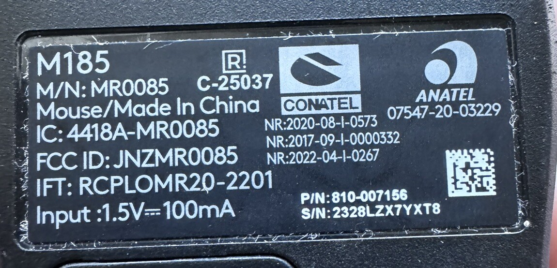 USB dongle included (receiver). This Logitech M185 Wireless Mouse is a great addition to your computer setup. With its sleek black design, it is sure to match any workspace. The mouse is made by the well-known brand Logitech, ensuring its quality and durability. The M185 is a standard mouse with a touchpad input that provides a smooth and efficient cursor control. It operates on 1.5V power and has a current of 100mA. This mouse is perfect for anyone who prefers a wireless setup, as it provides convenience and flexibility. Its model number is MR0085, and it is compatible with computers and tablets.